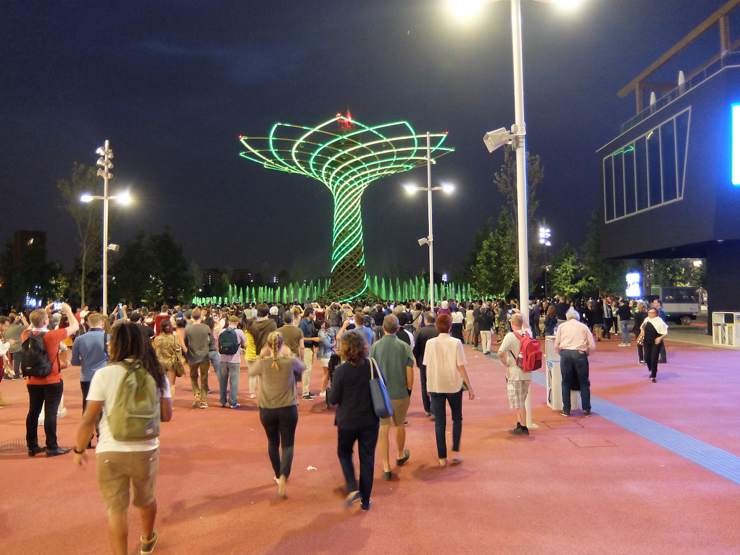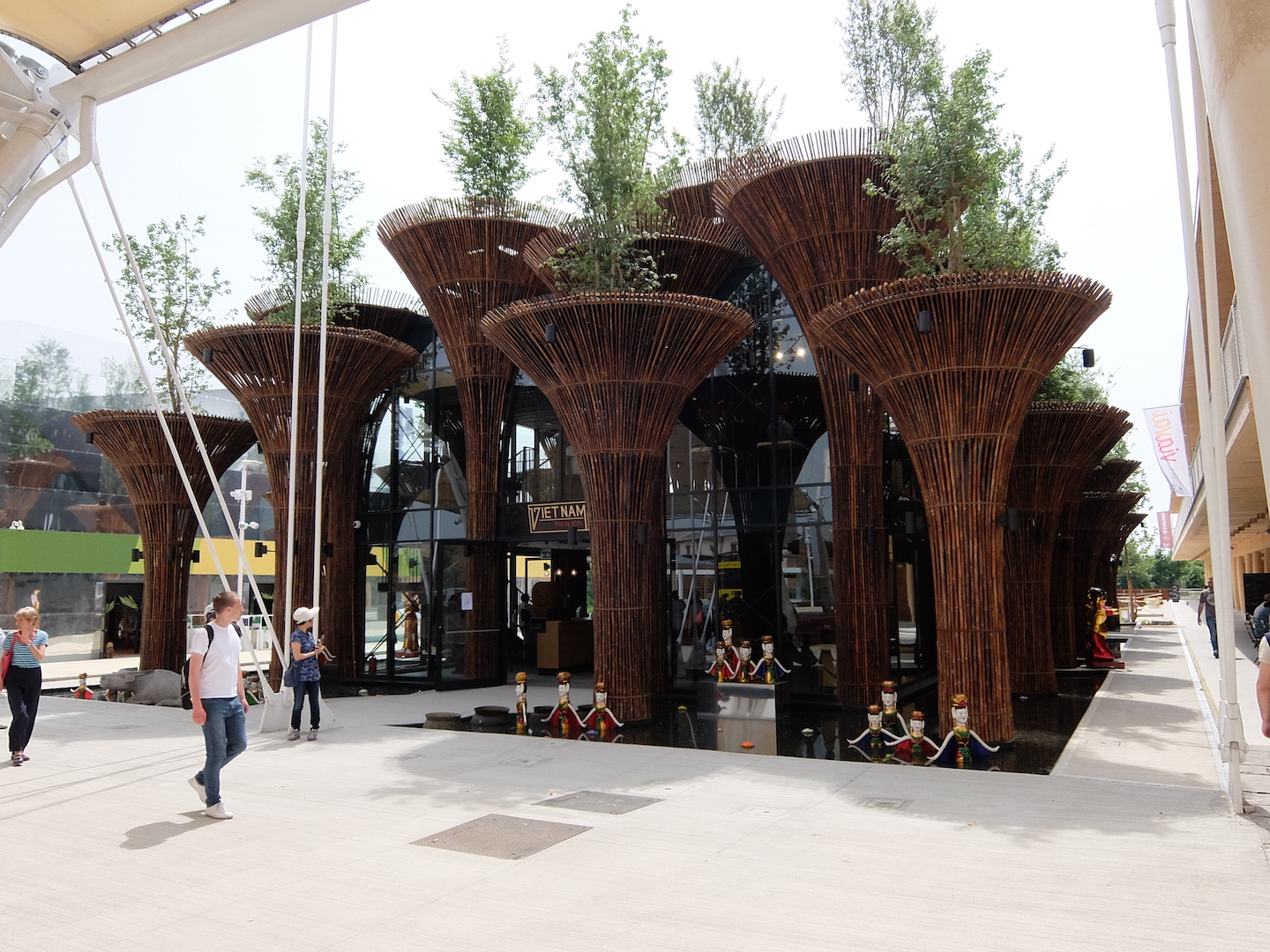 Some countries get the point of an expo but not of the foodie theme. Brazil has a bouncy climbing structure, while Russia’s mirrored, cantilevered erection is, says Burdett, “something an oligarch would build.” And, of course, a glib comparison to the global cucumber is apropos. The centerpiece of the whole exhibition, located at the south end of the cardo, next to the vast, white Italian pavilion, is the Tree of Life, designed by the event entrepreneur Marco Balich, and the focus for a fountain and multimedia light show every night of the expo. Like the “supertrees” at Singapore’s Gardens by the Bay, the form is the shape of a vortex like a tornado or a whirlpool, or perhaps the bell of a horn. (To describe the shape, an old friend suggests it might be called “vuvuzeliform,” in reference to vuvuzela, the stadium horn made famous by the 2010 soccer World Cup in South Africa.) Since the conflation of tree and vortex in Singapore, it’s become possible to see this “vuvuzeliform” as invoking the symbology of the tree of life, though this is an uncomfortable pairing, given that the tree of life is so often depicted with roots equivalent to its canopy. Rooted in the ground, reaching to the sky, a reflection of the cycle of life. The vortex/tree form appears everywhere at the Milan Expo, but it’s rootless.