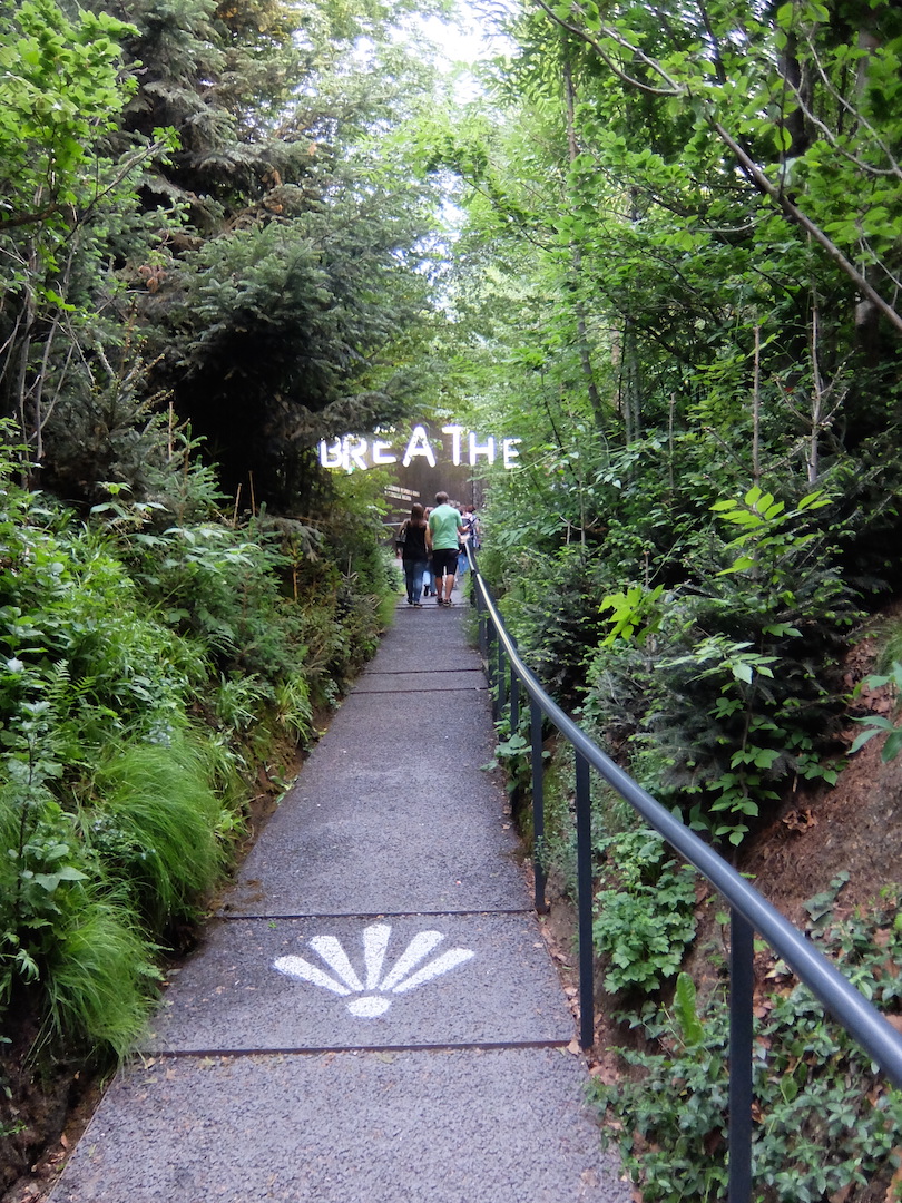 A path leads to the Austria Pavilion, which was designed by a team led by Klaus K. Loenhart, who is both an architect and a landscape architect.