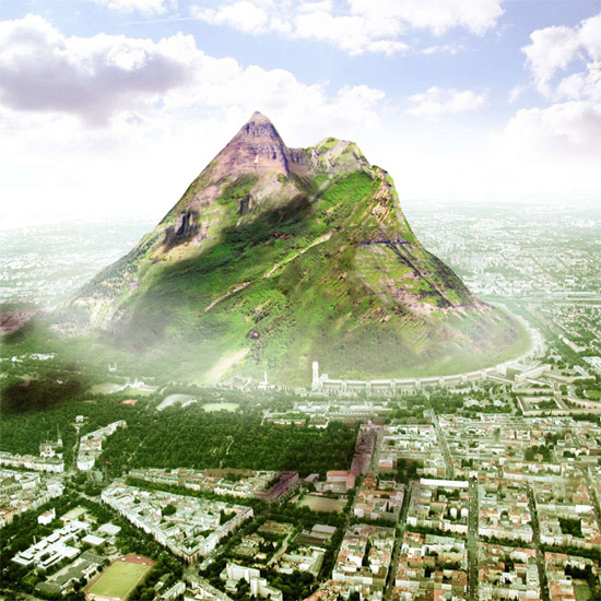 In the past few years there has been a curious rash of magic mountains proposed for various European cities that merge techniques of building and landscape architecture and which also mash together images of the urban sublime with that of the wilderness. Given the increasing propensity of contemporary governments to throw money at big signature projects instead of management or multitudes of small, meaningful projects, it may simply be a matter of time before someone builds one. The three proposed mountains are (in chronological order) as follows: